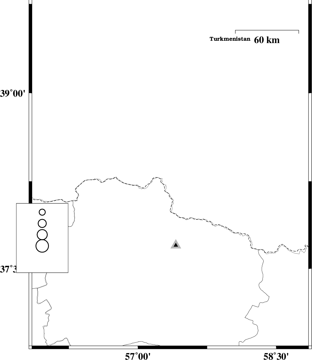 | 2009/11/22 | 21:32:48.4 | 01:02:48.4 | 38.33 | 57.35 | 17 | ML:2.5 | Turkmenistan, 95 km North of Bojnurd |