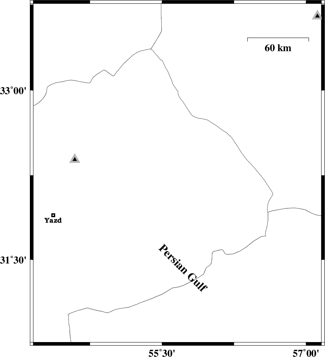 | 2009/11/21 | 19:06:35.4 | 22:36:35.4 | 32.19 | 56.05 | 14 | ML:2.9 | Yazd Province, 90 km North-East of Bafq |