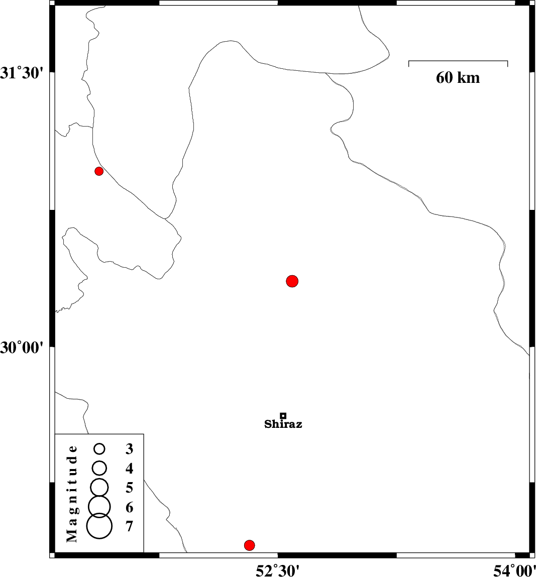 | 2010/03/24 | 01:47:54.8 | 06:17:54.8 | 28.9 | 52.32 | 14 | ML:3 | Fars Province, 22 km East of Farashband |