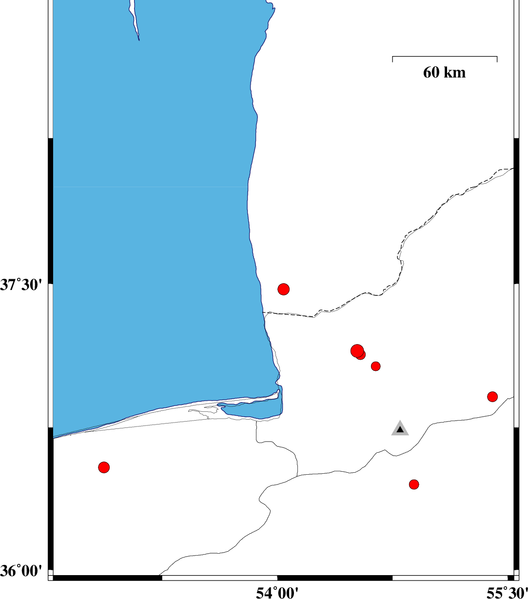 2009/11/18 | 17:57:14.2 | 21:27:14.2 | 37.13 | 54.54 | 15 | ML:3 | Golestan Province, 15 km North of Aq Qaleh | ||
