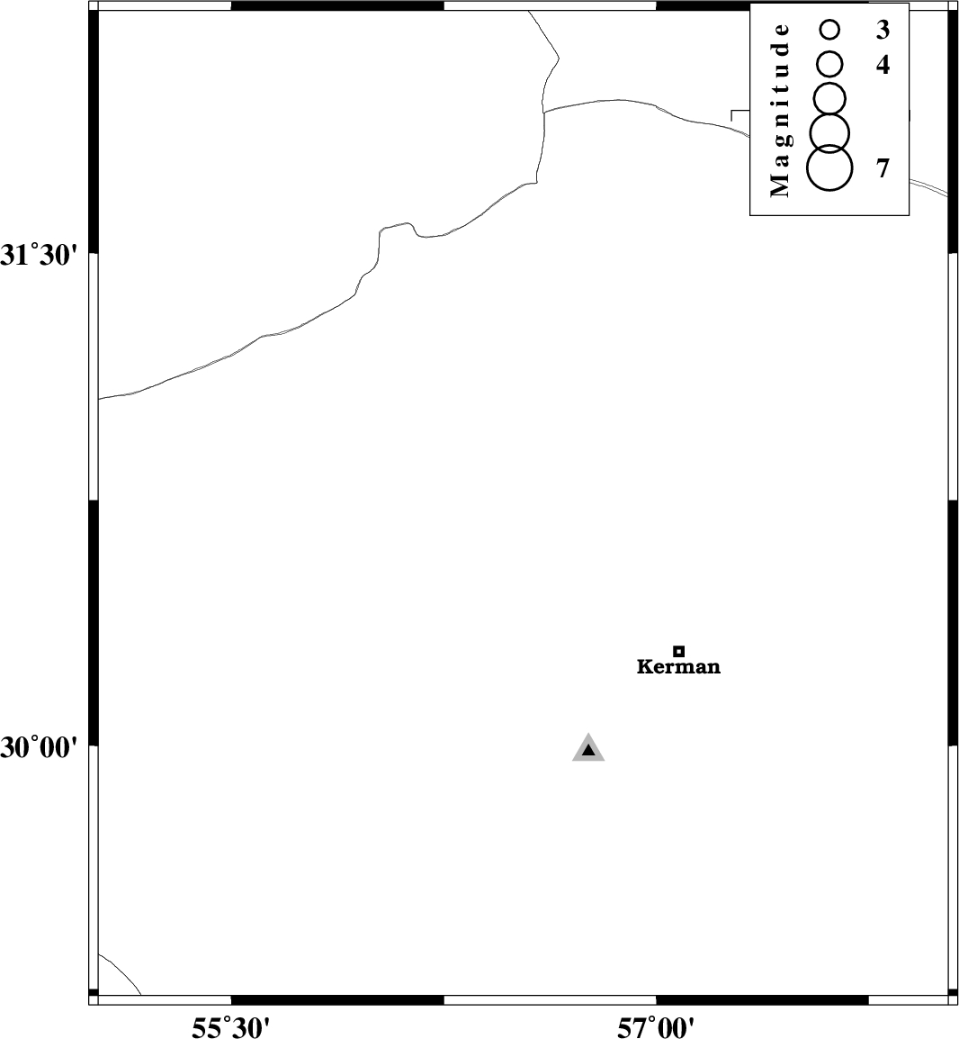 2010/03/25 | 01:49:38.1 | 06:19:38.1 | 30.45 | 57.49 | 6 | ML:3.1 | Kerman Province, 43 km North-East of Kerman |