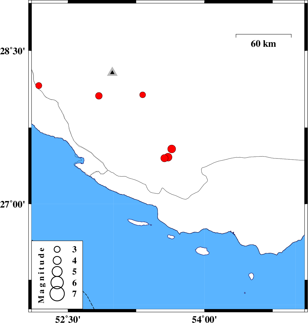 | 2010/04/01 | 07:31:59.8 | 12:01:59.8 | 27.46 | 53.6 | 40 | ML:3.9 | Fars Province, 45 km North-East of Lamerd | ||