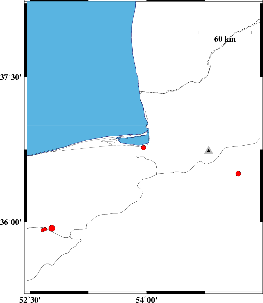 2010/04/04 | 02:21:48.5 | 06:51:48.5 | 36.5 | 55.18 | 17 | ML:2.9 | Semnan Province, 21 km East of Shahrud | ||