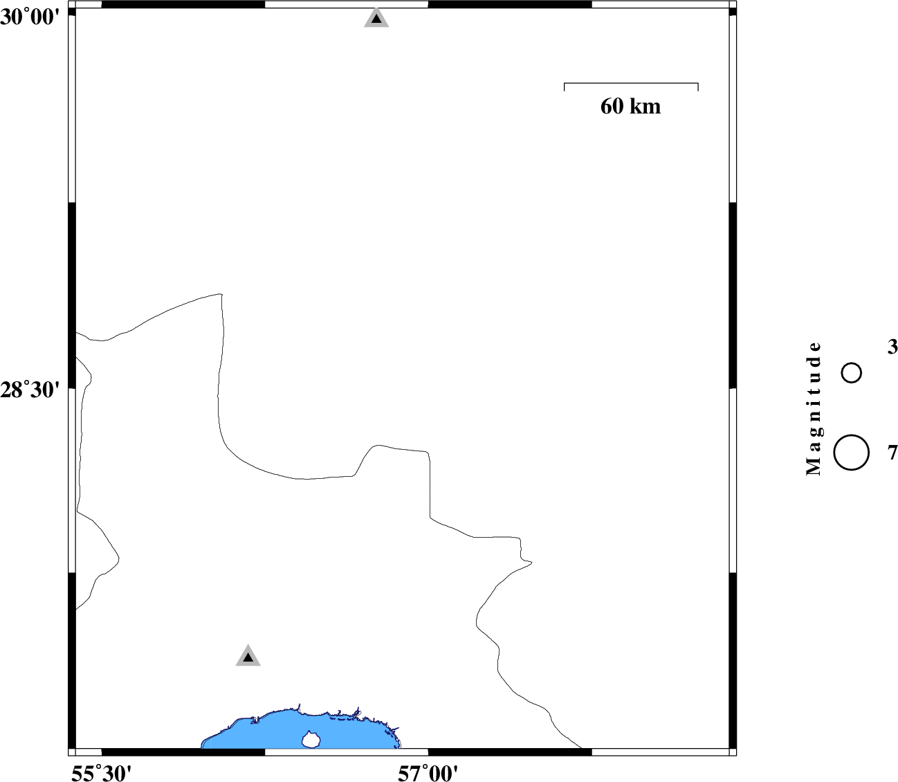 2010/03/14 | 08:53:55.9 | 12:23:55.9 | 27.47 | 58.29 | 28 | ML:3.1 | Kerman Province, 79 km East of Manujan |
