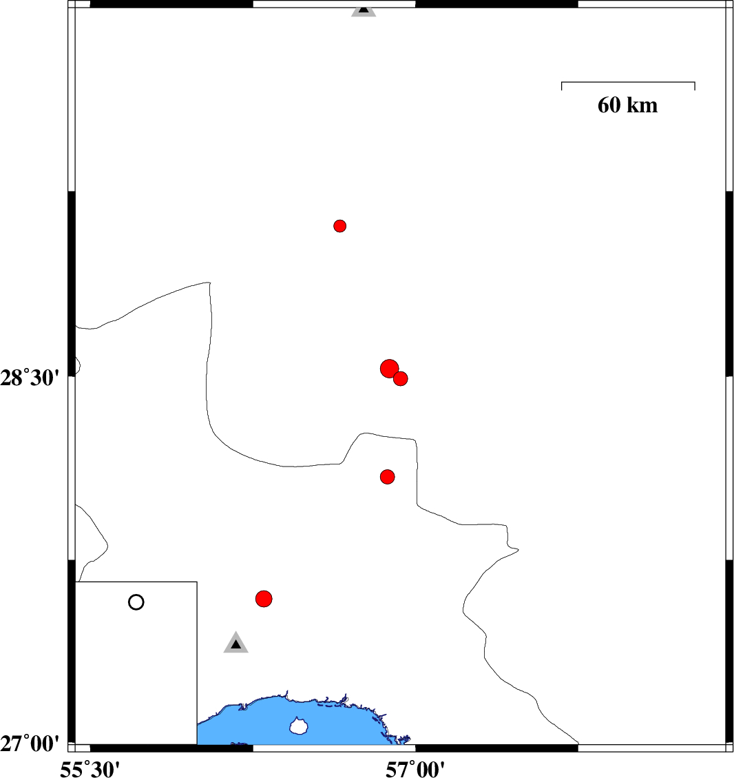2010/03/28 | 02:01:45.7 | 06:31:45.7 | 28.09 | 56.87 | 15 | ML:3 | Hormozgan Province, 82 km North-West of Kahnuj |