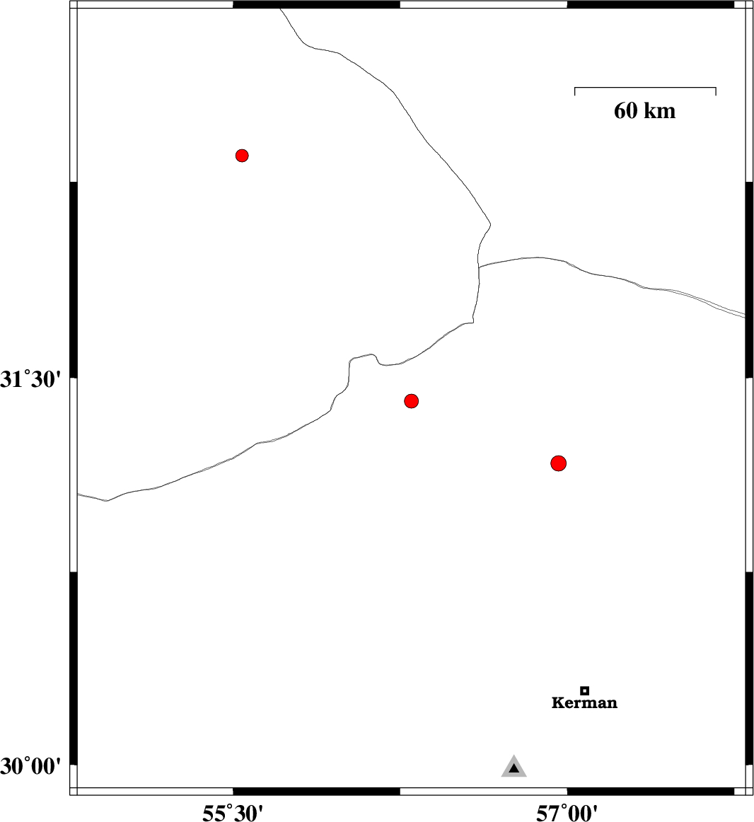 2010/04/15 | 00:56:20.3 | 05:26:20.3 | 31.41 | 56.3 | 14 | ML:2.8 | Kerman Province, 51 km North-West of Ravar | ||
