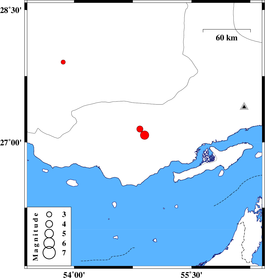 | 2010/04/27 | 22:58:00.7 | 03:28:00.7 | 27.08 | 54.9 | 32 | ML:5 | Hormozgan Province, 62 km North of Bandar-e lengeh | ||
