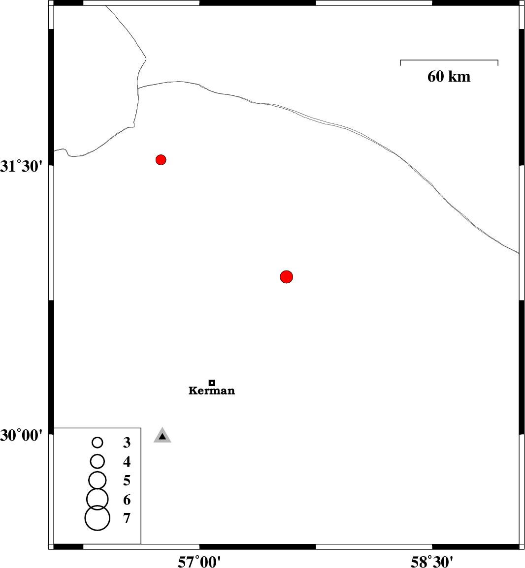 2010/04/26 | 14:45:37.7 | 19:15:37.7 | 31.53 | 56.75 | 18 | ML:3 | Kerman Province, 29 km North of Ravar |
