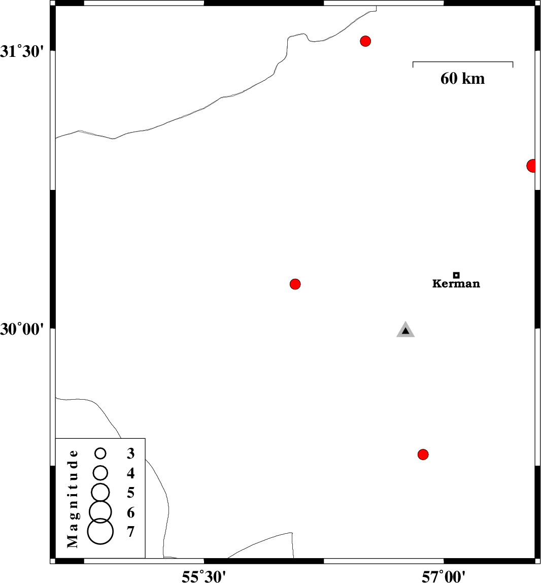 | 2010/05/07 | 19:32:30.2 | 00:02:30.2 | 30.24 | 56.07 | 18 | ML:3 | Kerman Province, 19 km South of Rafsanjan | ||
