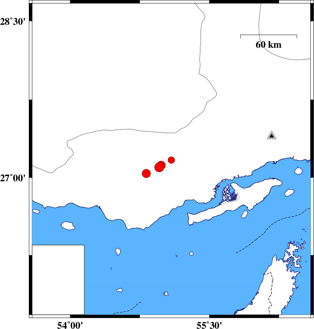 2010/05/14 | 09:33:18.7 | 14:03:18.7 | 27.1 | 54.96 | 41 | ML:4.5 | Hormozgan Province, 65 km North-East of Bandar-e lengeh | ||