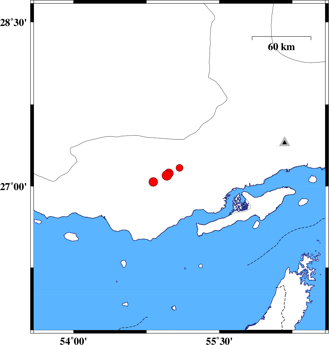 | 2010/05/14 | 09:33:18.7 | 14:03:18.7 | 27.1 | 54.96 | 41 | ML:4.5 | Hormozgan Province, 65 km North-East of Bandar-e lengeh | ||