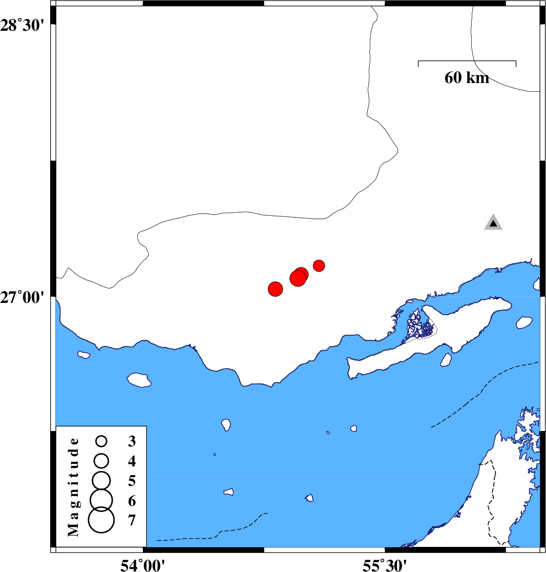 | 2010/05/14 | 09:33:18.7 | 14:03:18.7 | 27.1 | 54.96 | 41 | ML:4.5 | Hormozgan Province, 65 km North-East of Bandar-e lengeh | ||
