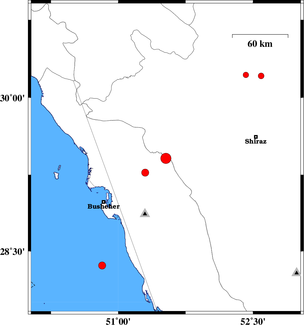2010/05/06 | 11:11:51.7 | 15:41:51.7 | 28.36 | 50.82 | 37 | ML:3.6 | Persian Gulf, 70 km South of Busheher | ||