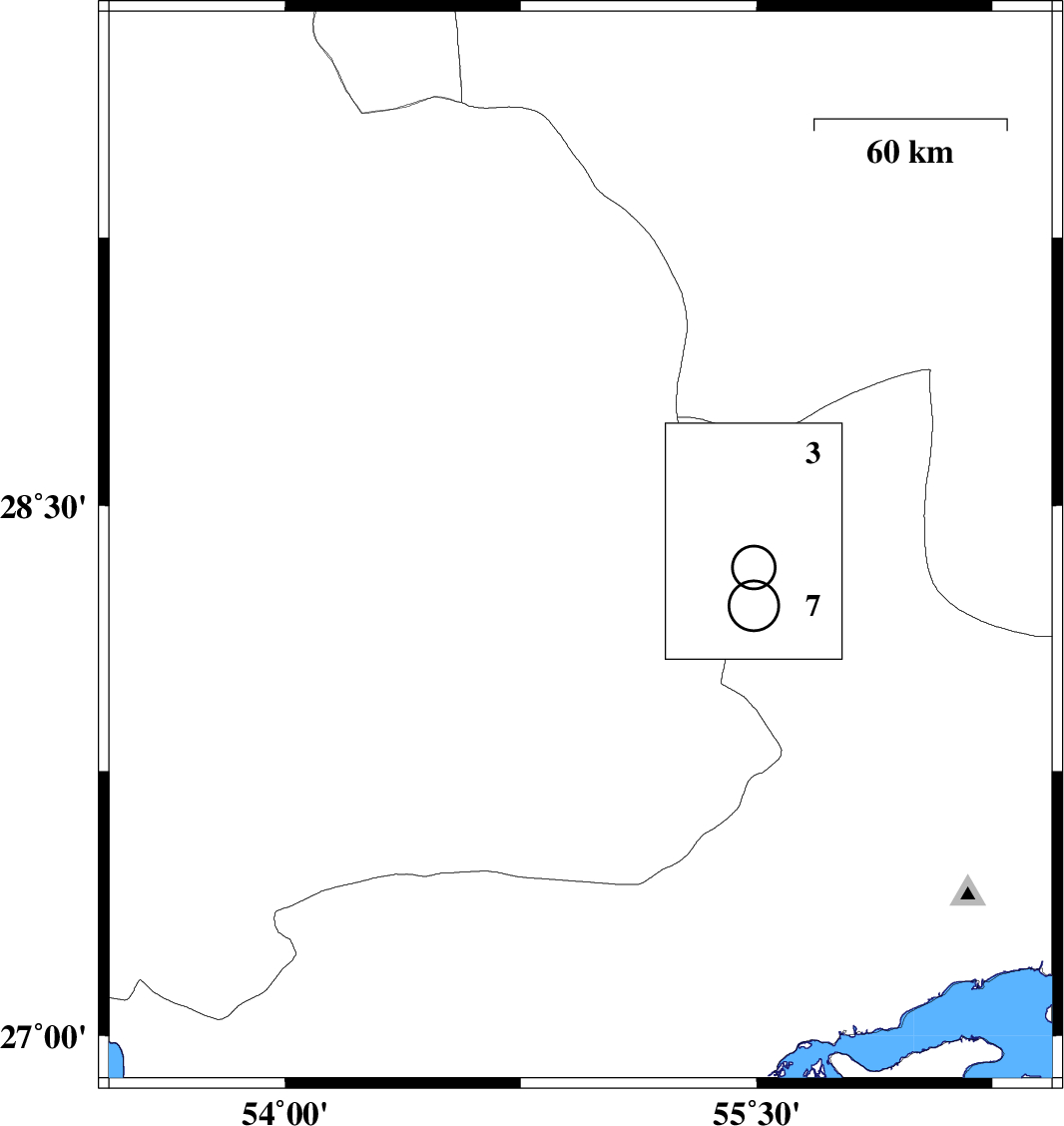 2010/05/16 | 04:35:24.4 | 09:05:24.4 | 28.38 | 54.94 | 14 | ML:3.5 | Fars Province, 57 km South-East of Darab | ||