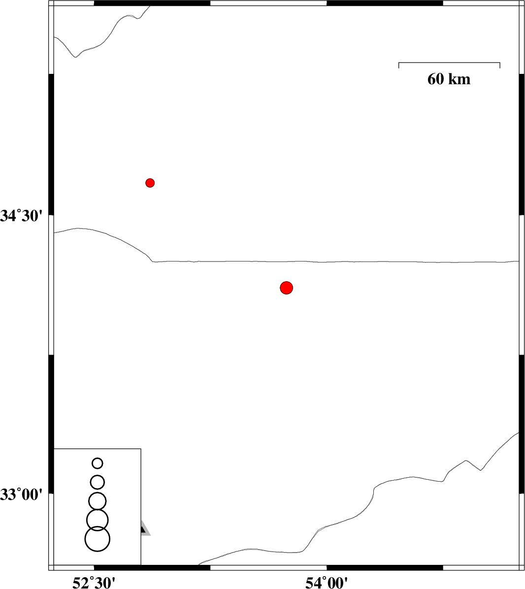 2010/05/13 | 19:08:24.9 | 23:38:24.9 | 34.67 | 52.86 | 6 | ML:2.6 | Semnan Province, 77 km South-East of Garmsar |