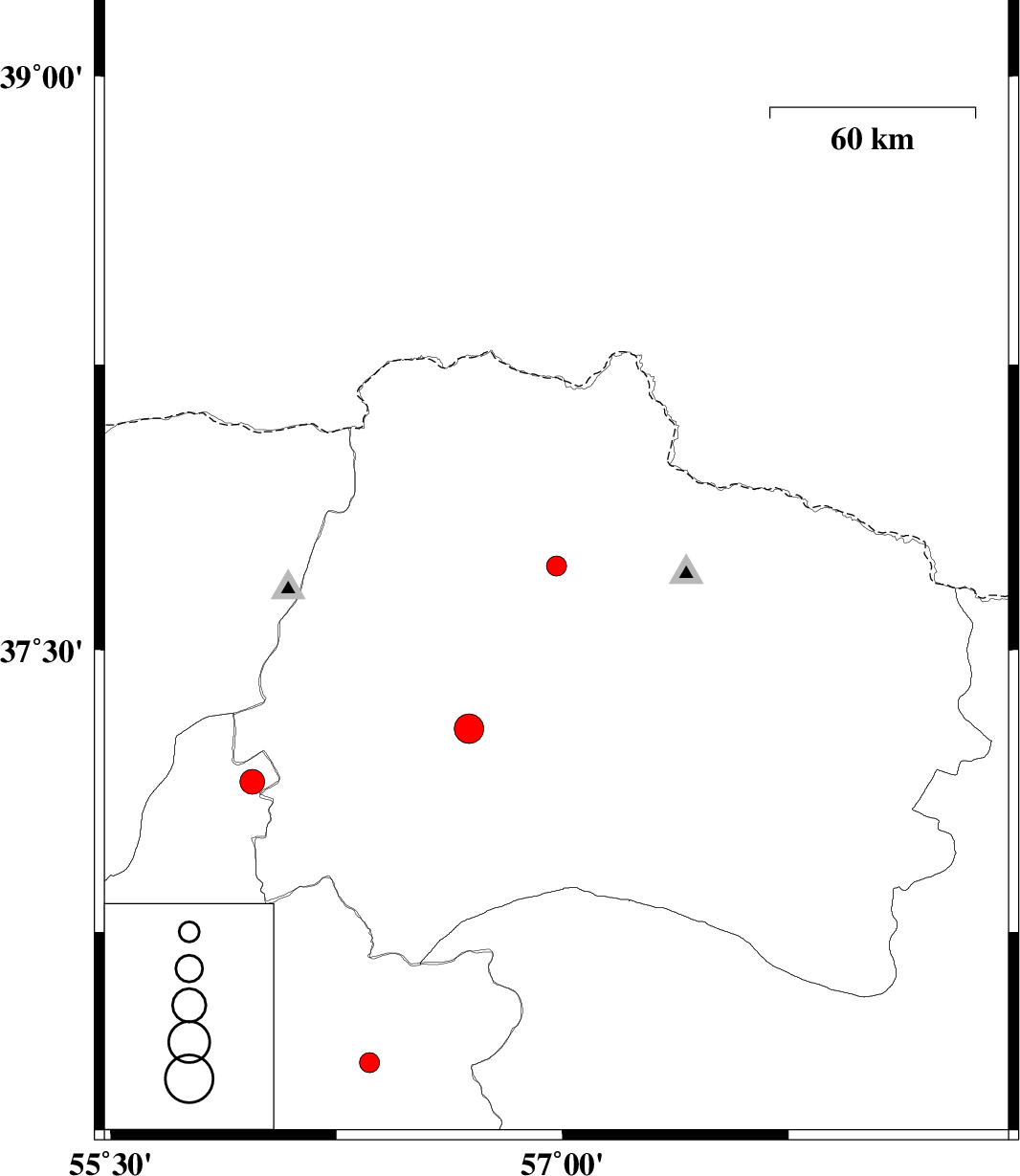 2010/05/12 | 21:11:29.3 | 01:41:29.3 | 37.15 | 55.97 | 6 | ML:3.6 | Semnan Province, 44 km North-West of Jajarm | ||