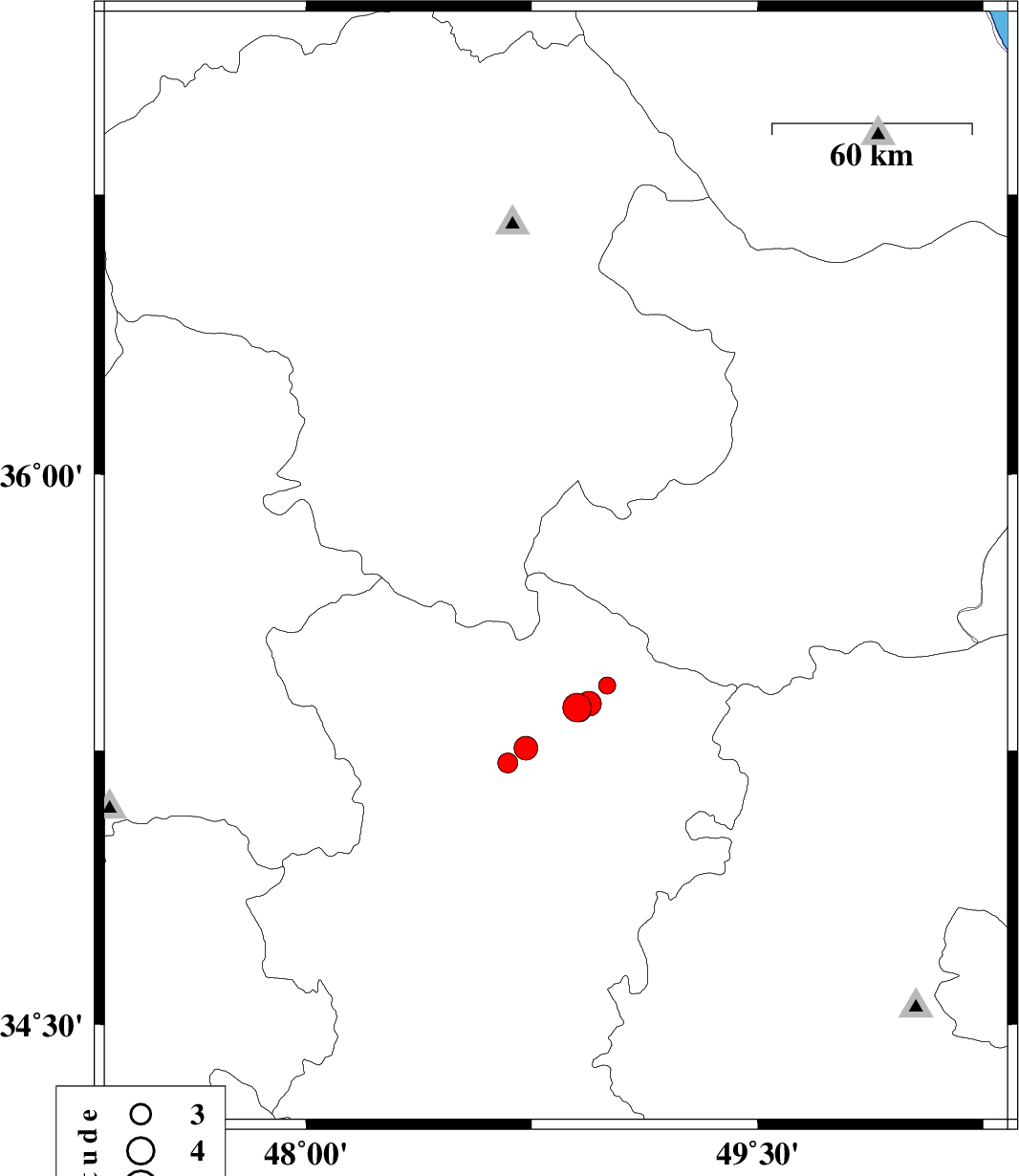 2010/04/28 | 17:39:16.3 | 22:09:16.3 | 35.9 | 49.1 | 14 | ML:3.6 | Ghazvin Province, 29 km South-West of Abhar |