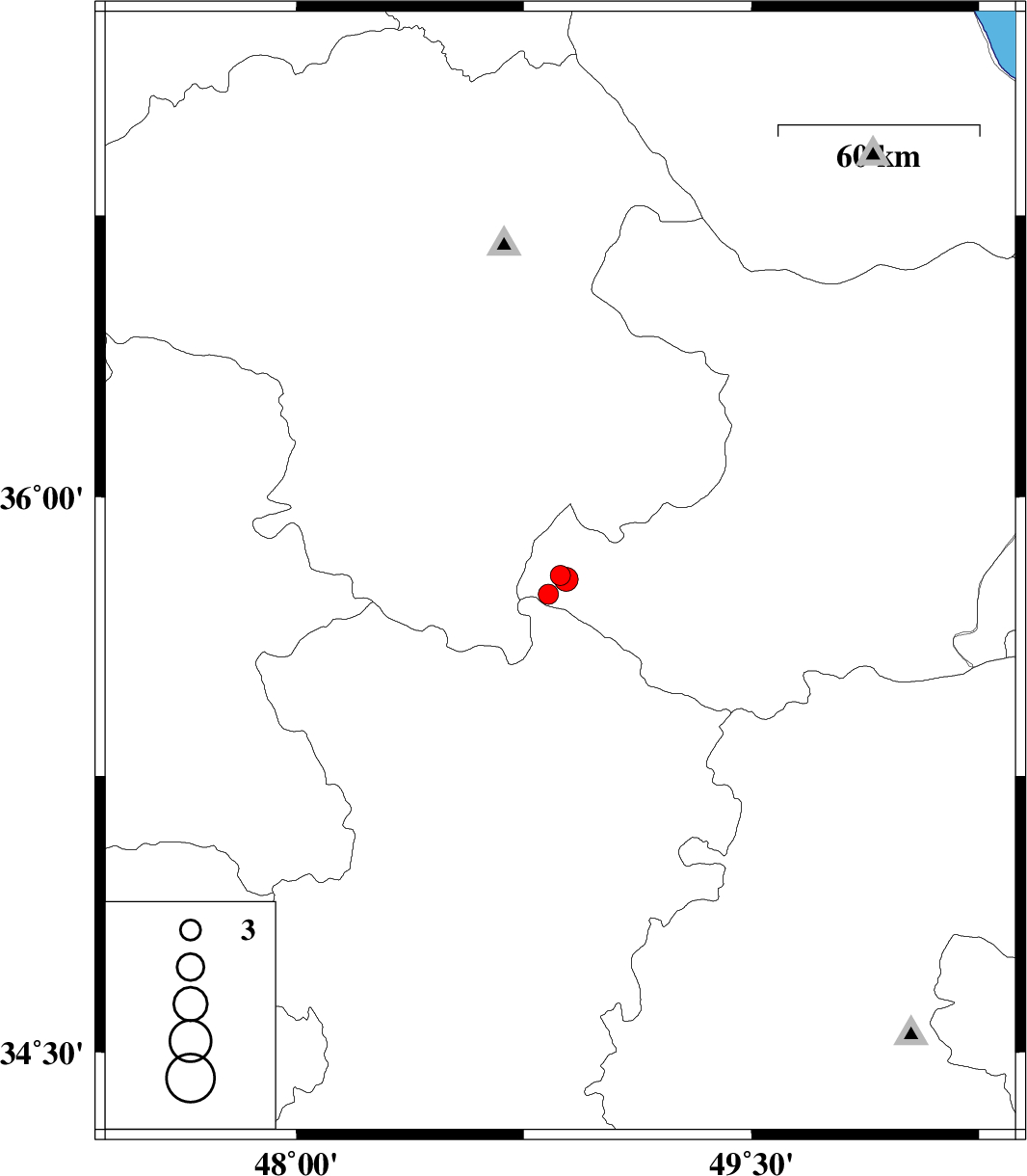 | 2010/05/22 | 04:40:46.7 | 09:10:46.7 | 35.79 | 48.87 | 14 | ML:3 | Ghazvin Province, 47 km North-West of Razan | ||
