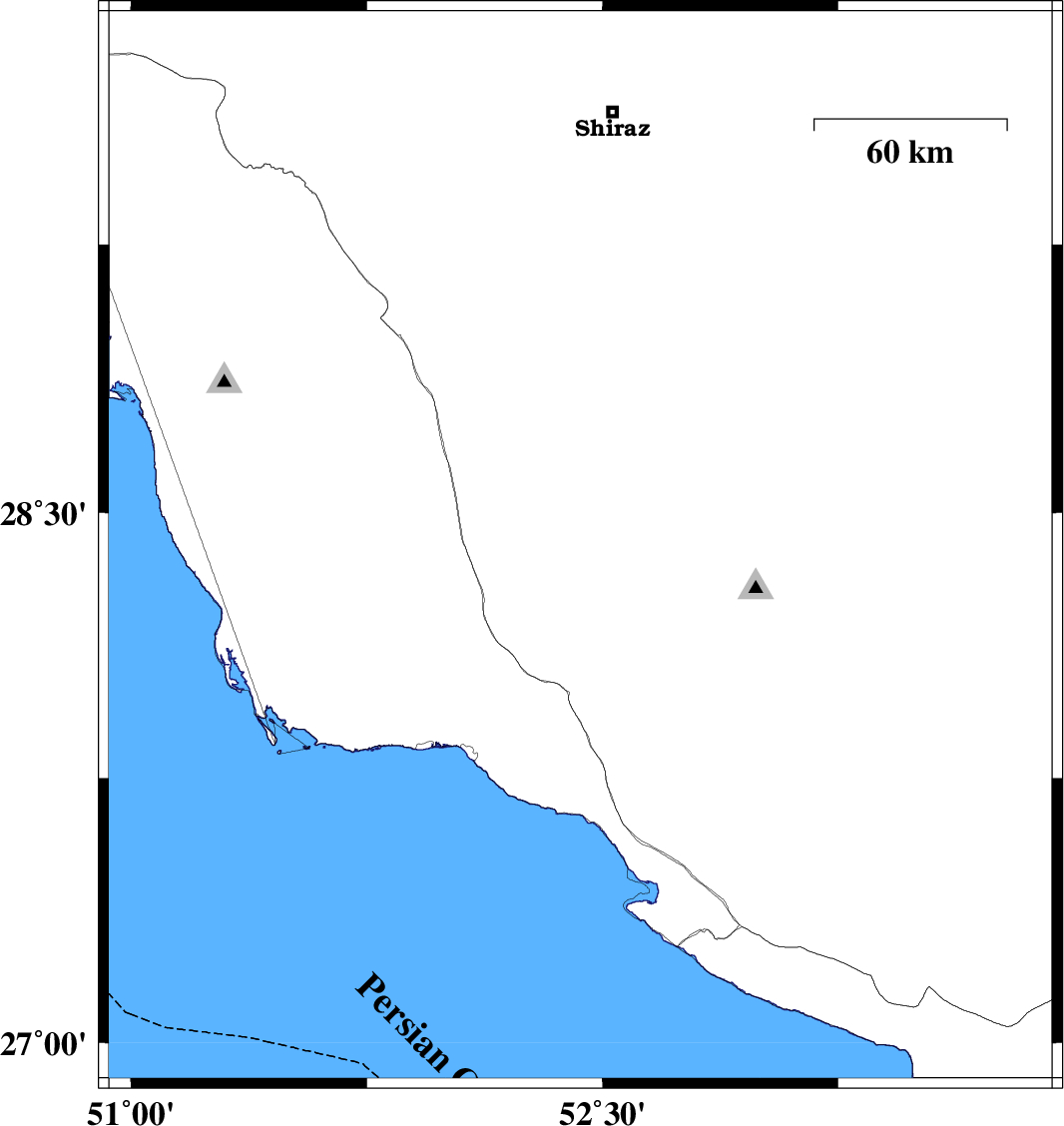 | 2010/05/28 | 07:23:40.1 | 11:53:40.1 | 28.4 | 52.43 | 14 | ML:3.9 | Fars Province, 50 km South-West of Firuz Abad |