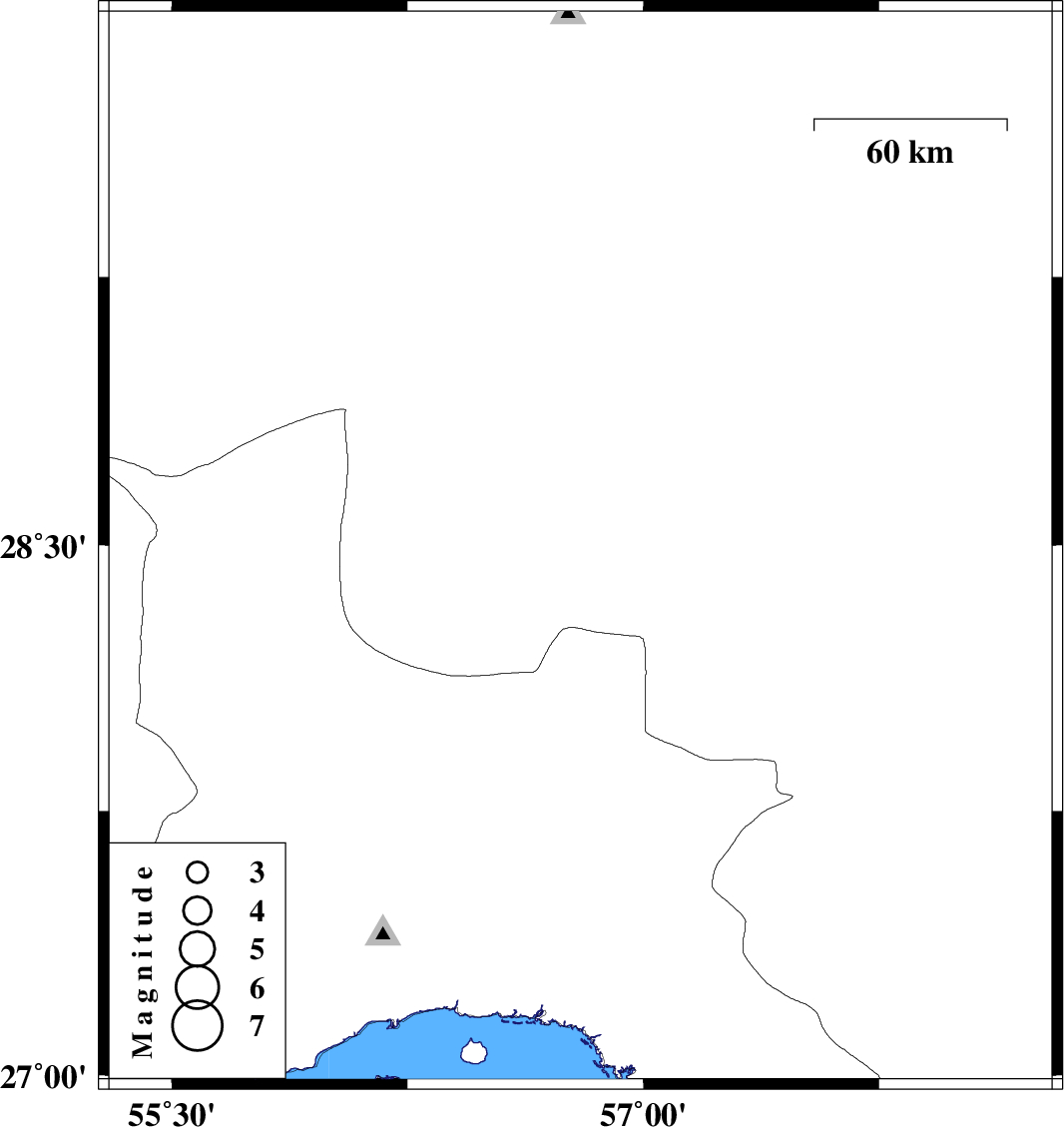 | 2010/06/06 | 17:49:00.2 | 22:19:00.2 | 28.49 | 56.8 | 46 | ML:4.3 | Kerman Province, 85 km South-East of Baft |