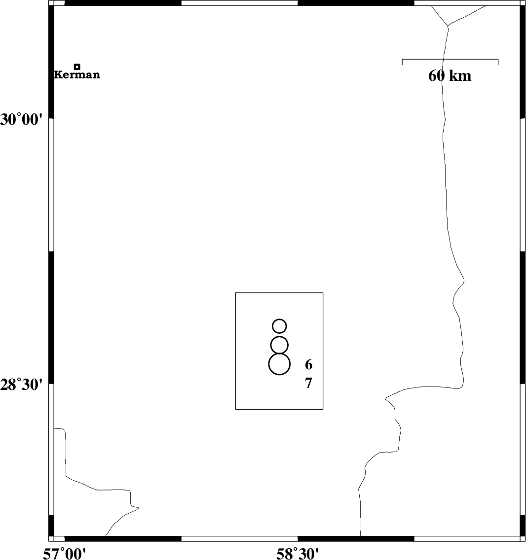 2010/05/03 | 06:16:31.8 | 10:46:31.8 | 28.98 | 57.91 | 14 | ML:2.8 | Kerman Province, 39 km North-East of Jiroft |