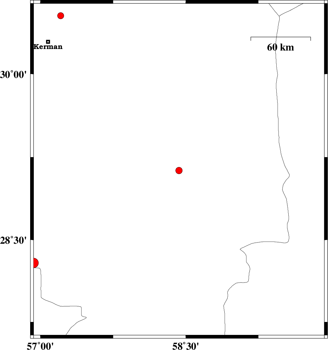 | 2010/06/01 | 05:41:35.4 | 10:11:35.4 | 30.52 | 57.21 | 10 | ML:3 | Kerman Province, 29 km North-East of Kerman | ||
