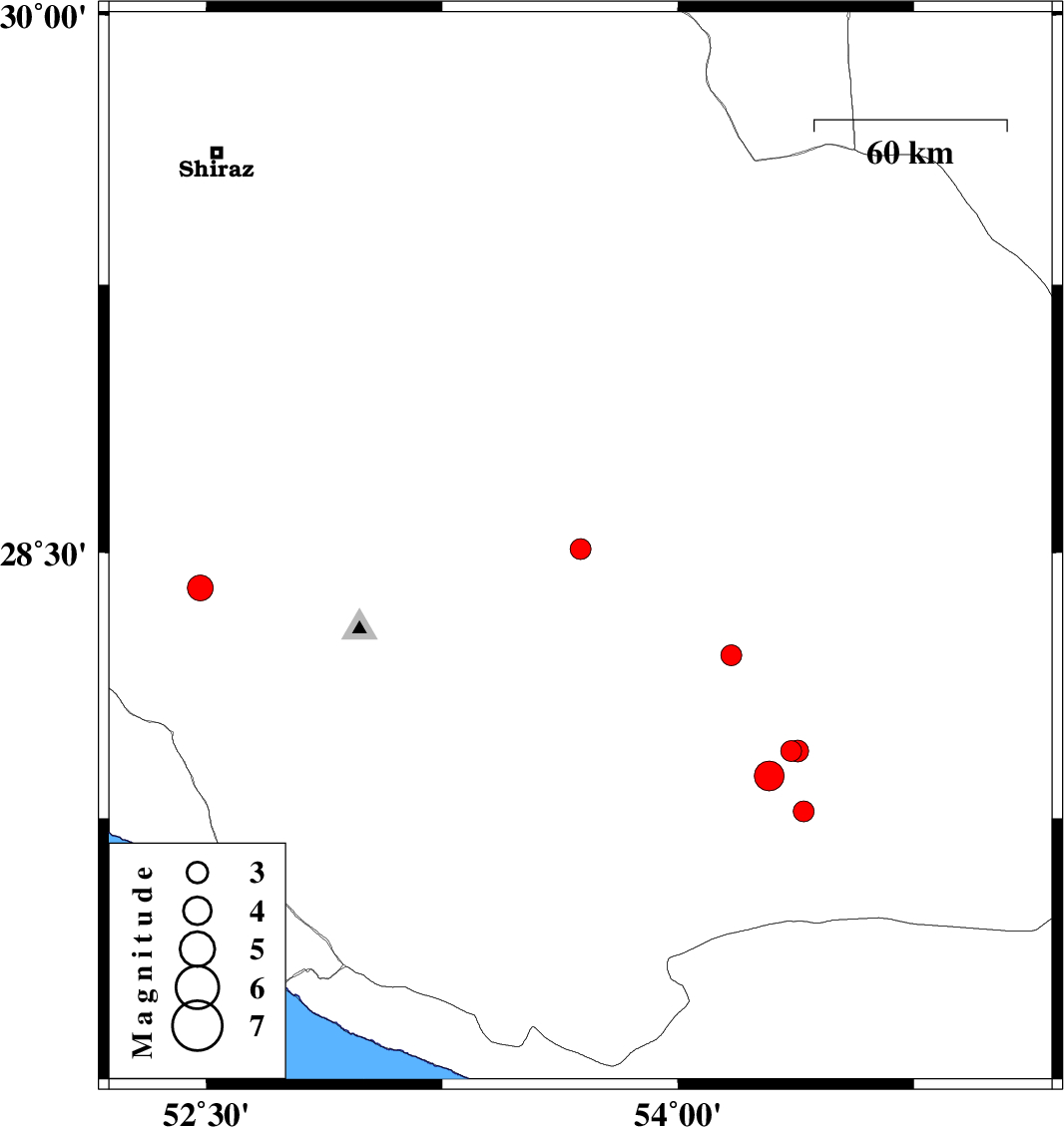 | 2010/06/20 | 13:35:01.3 | 18:05:01.3 | 27.87 | 54.29 | 44 | ML:4.2 | Fars Province, 22 km North of Lar | ||