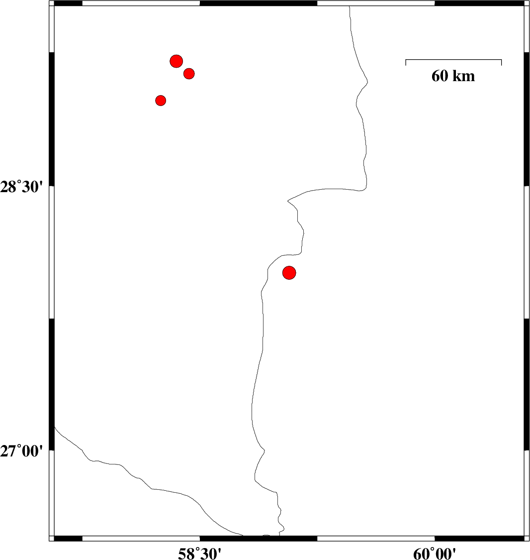 2010/06/23 | 15:20:24.3 | 19:50:24.3 | 28.01 | 59.07 | 15 | ML:3.8 | Sistan va Baloochestan Province, 136 km East of Kahnuj | ||