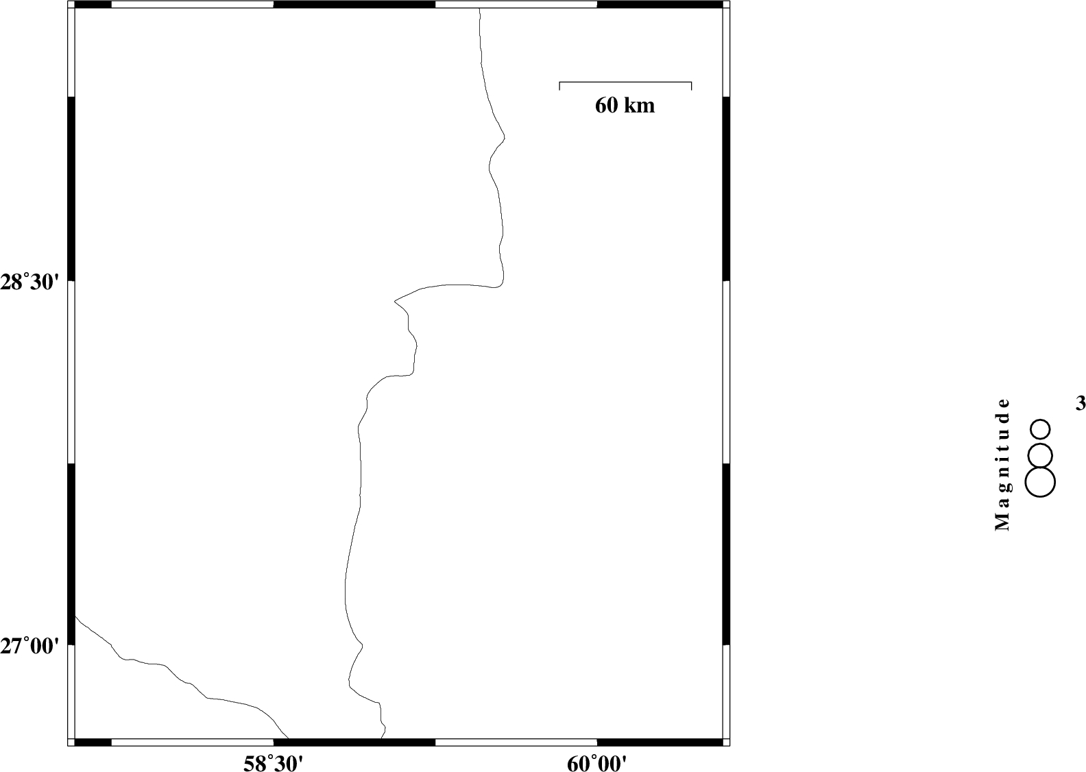 2010/06/24 | 20:41:57.5 | 01:11:57.5 | 28.11 | 59.08 | 14 | ML:3 | Kerman Province, 137 km North-East of Kahnuj | ||