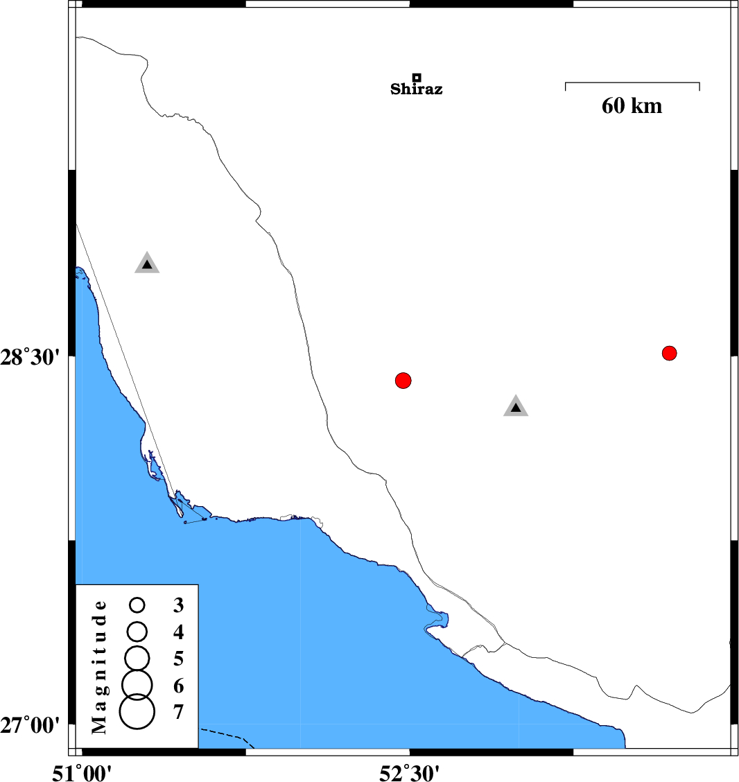 2010/06/27 | 18:38:57.4 | 23:08:57.4 | 28.4 | 52.47 | 2 | ML:3.2 | Fars Province, 48 km South-West of Firuz Abad | ||
