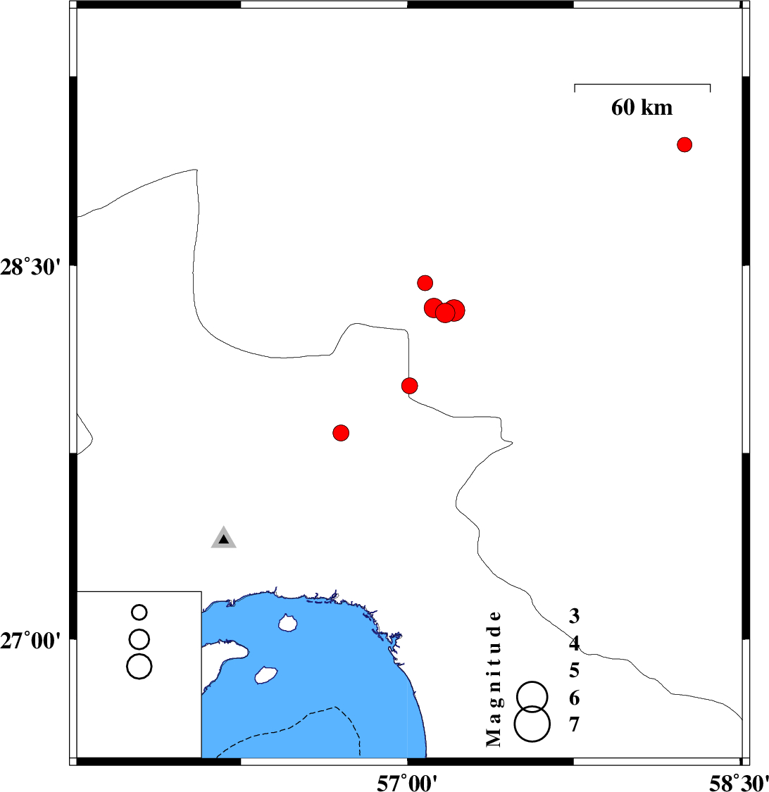 2010/06/30 | 04:13:59.7 | 08:43:59.7 | 27.83 | 56.7 | 14 | ML:3.3 | Hormozgan Province, 70 km North-West of Dehbarez | ||