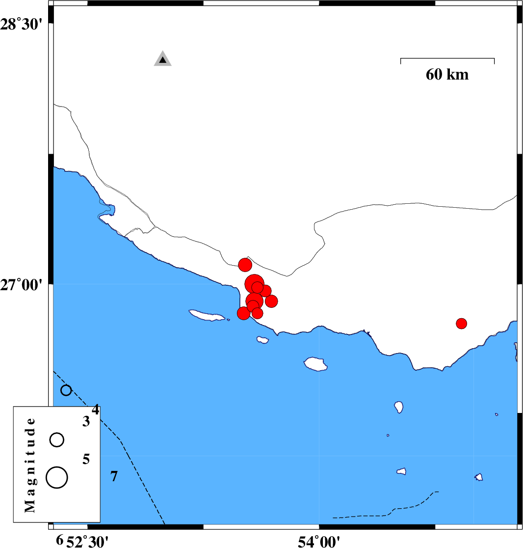2010/07/20 20:24:52.4 00:54:52.4 26.8953.9518 ML:3.7 Hormozgan Province, 53 km South-West of Bastak
