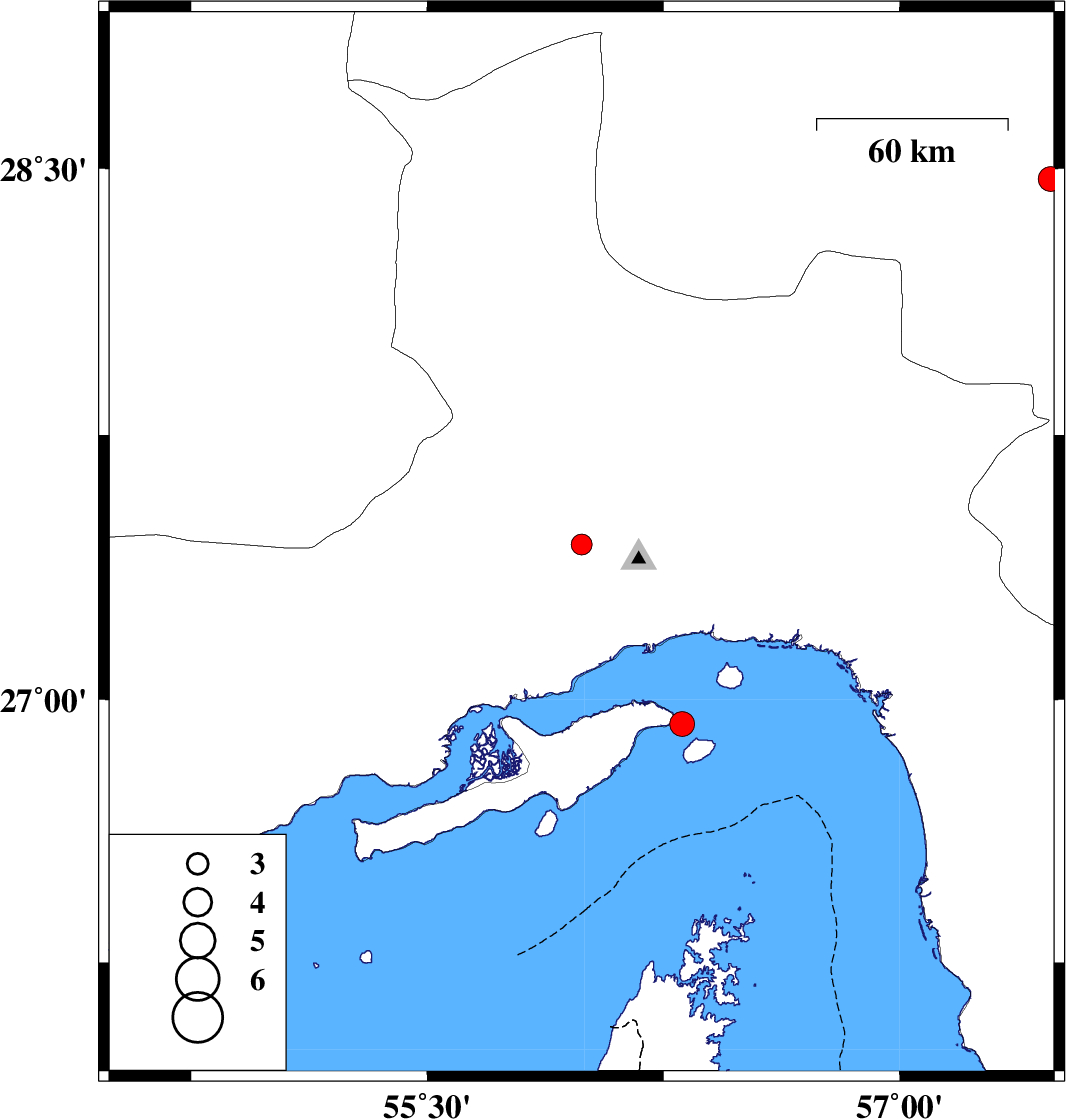 2010/07/14 | 14:12:49.4 | 18:42:49.4 | 26.93 | 56.31 | 8 | ML:3.5 | Persian Gulf, 5 km Qeshm | ||