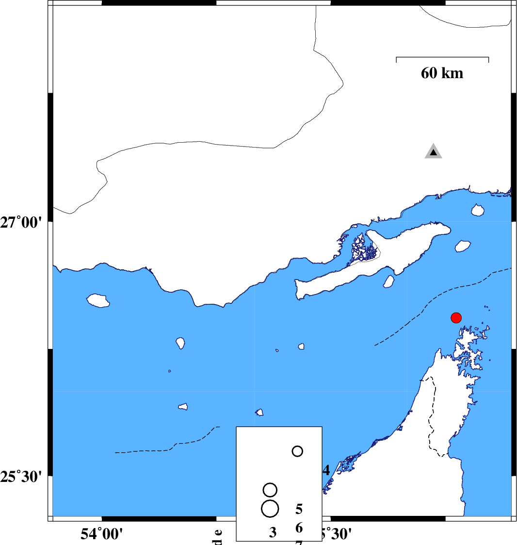 2010/07/14 | 14:12:49.4 | 18:42:49.4 | 26.93 | 56.31 | 8 | ML:3.5 | Persian Gulf, 5 km Qeshm |