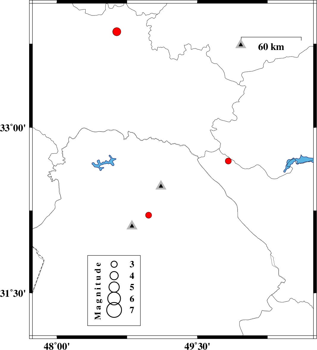 | 2010/07/18 | 11:46:16.8 | 16:16:16.8 | 33.77 | 48.05 | 15 | ML:4 | Lorestan Province, 26 km West of Aleshtar |