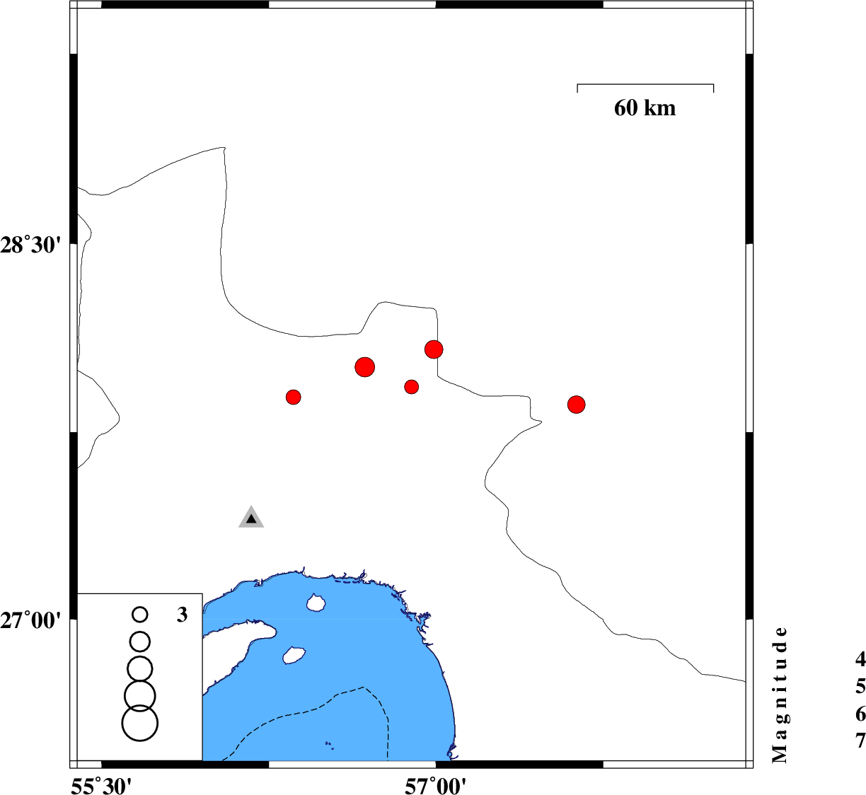 2010/07/27 | 18:43:53.1 | 23:13:53.1 | 28.08 | 56.99 | 15 | ML:3.6 | Hormozgan Province, 70 km North-West of Kahnuj | ||