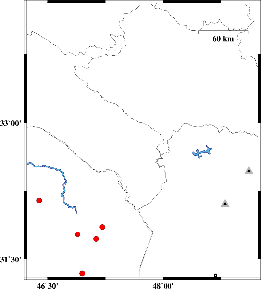 2010/07/30 | 17:16:24.8 | 21:46:24.8 | 32.94 | 47.91 | 46 | ML:2.9 | Lorestan Province, 30 km South-East of Pol-e dokhtar | ||