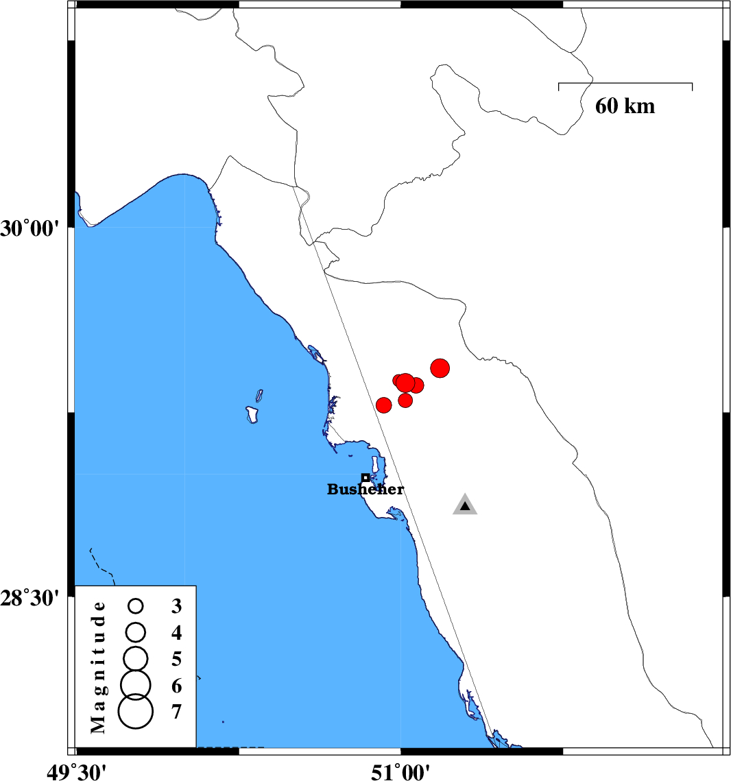 2010/08/06 | 20:08:31.5 | 00:38:31.5 | 29.28 | 50.92 | 40 | ML:3.3 | Bushehr Province, 28 km West of Borazjan | ||