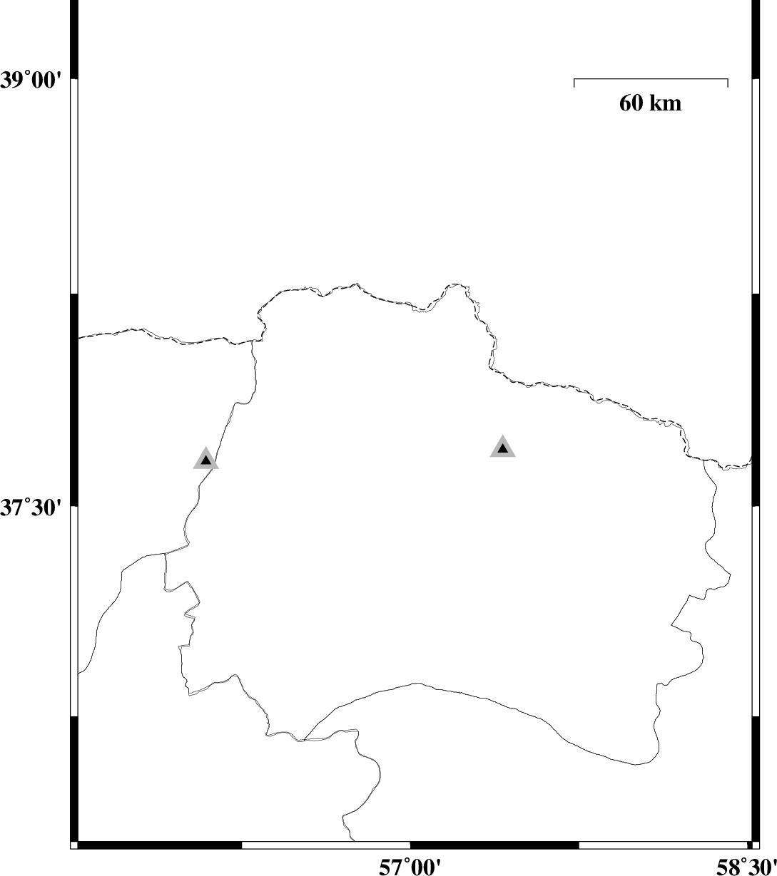 2010/08/11 | 06:45:19.2 | 11:15:19.2 | 37.48 | 56.66 | 15 | ML:2.9 | Khorasan(north) Province, 26 km West of Ashkhaneh | ||