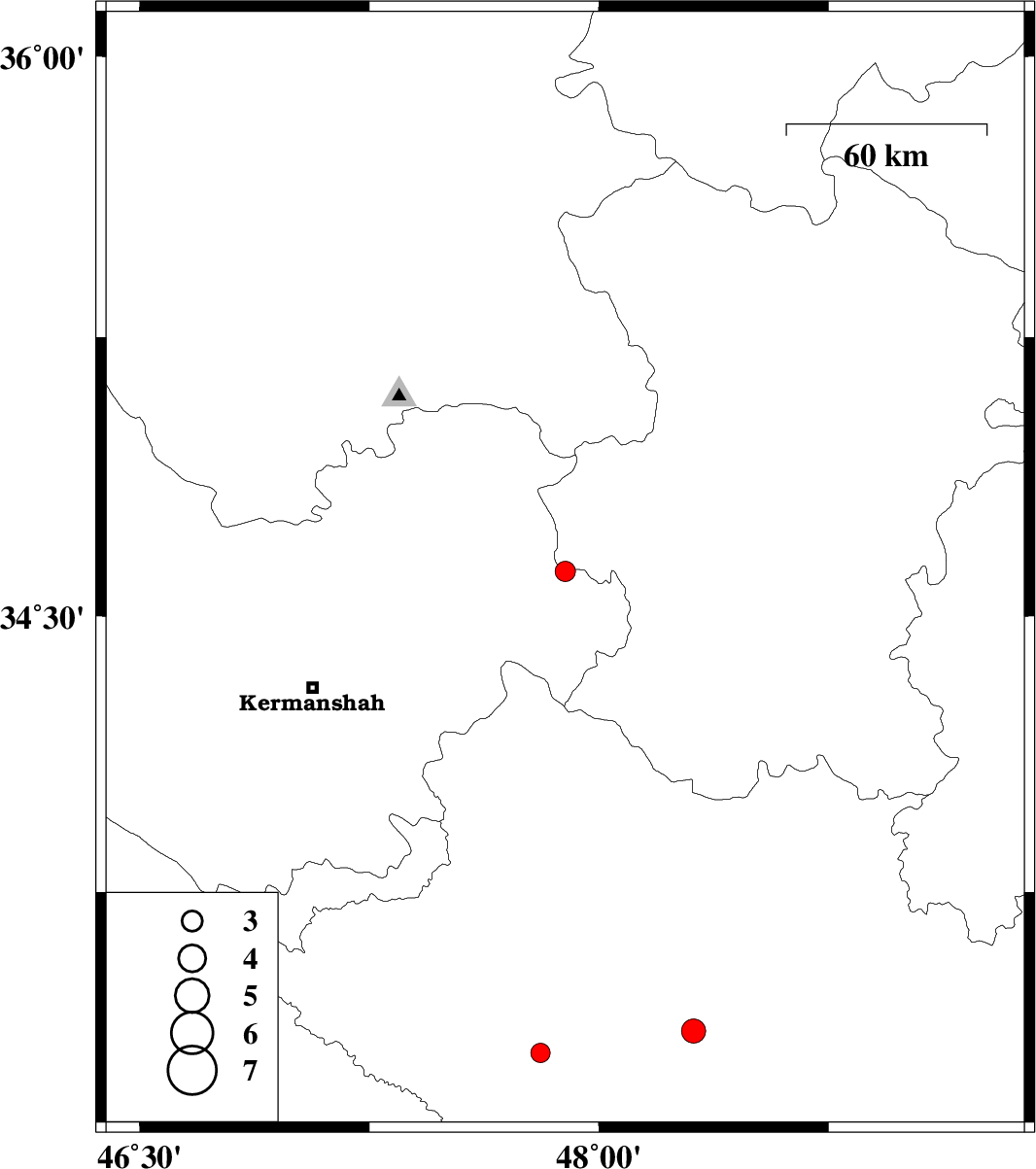 | 2010/08/13 | 22:48:37.0 | 03:18:37.0 | 34.62 | 47.89 | 14 | ML:2.9 | Kermanshah Province, 15 km North of Kangavar | ||