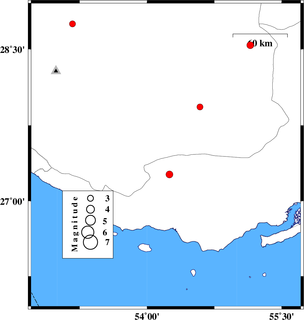 2010/08/07 | 03:34:12.8 | 08:04:12.8 | 28.06 | 54.77 | 14 | ML:3.5 | Fars Province, 60 km North-East of Lar |