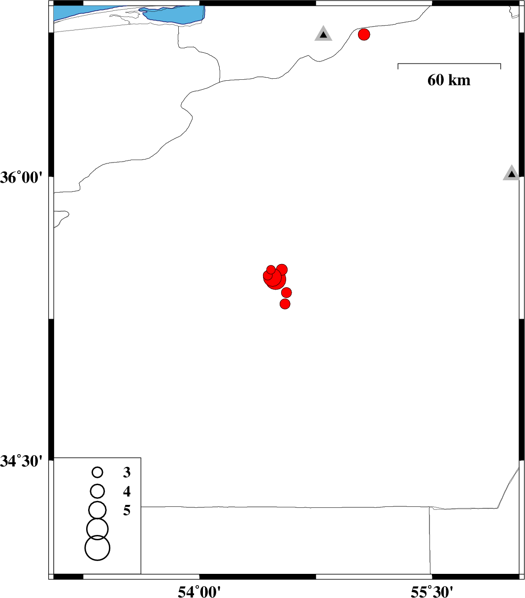 2010/08/27 | 19:23:48.0 | 23:53:48.0 | 35.46 | 54.49 | 14 | ML:5.9 | Semnan Province, 79 km South-East of Damghan | ||