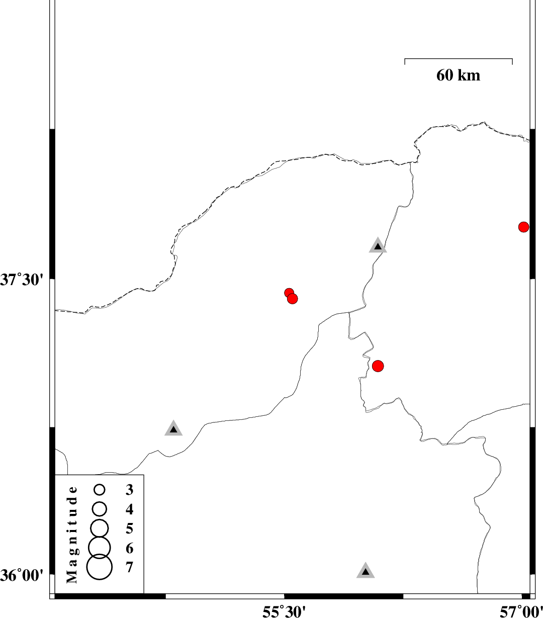 2010/08/19 | 08:28:10.5 | 12:58:10.5 | 37.06 | 56.09 | 18 | ML:3.3 | Khorasan(north) Province, 29 km North-West of Jajarm | ||