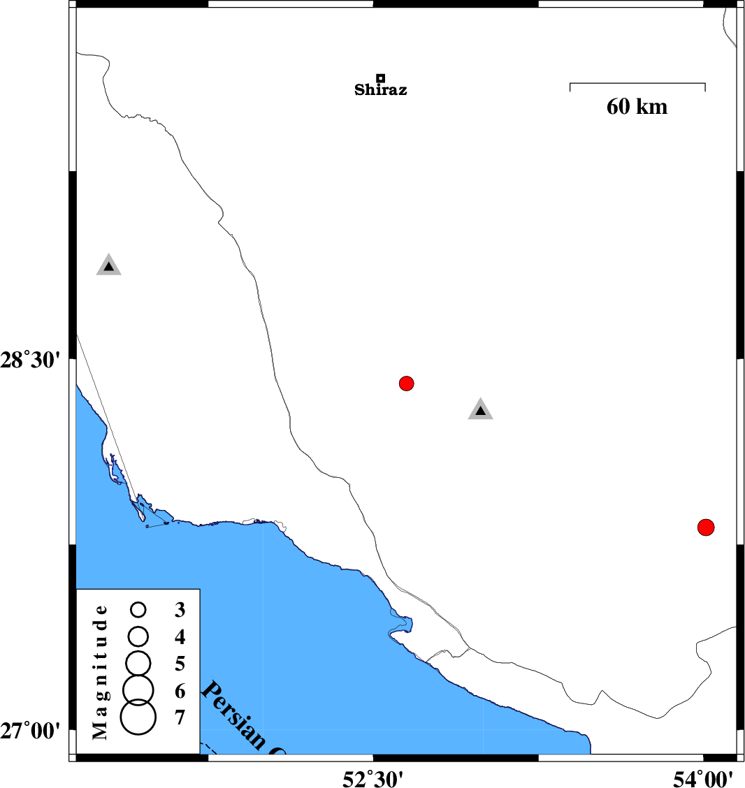| 2010/08/24 | 12:37:15.0 | 17:07:15.0 | 28.4 | 52.65 | 15 | ML:3 | Fars Province, 38 km West of Qir va Karzin | ||