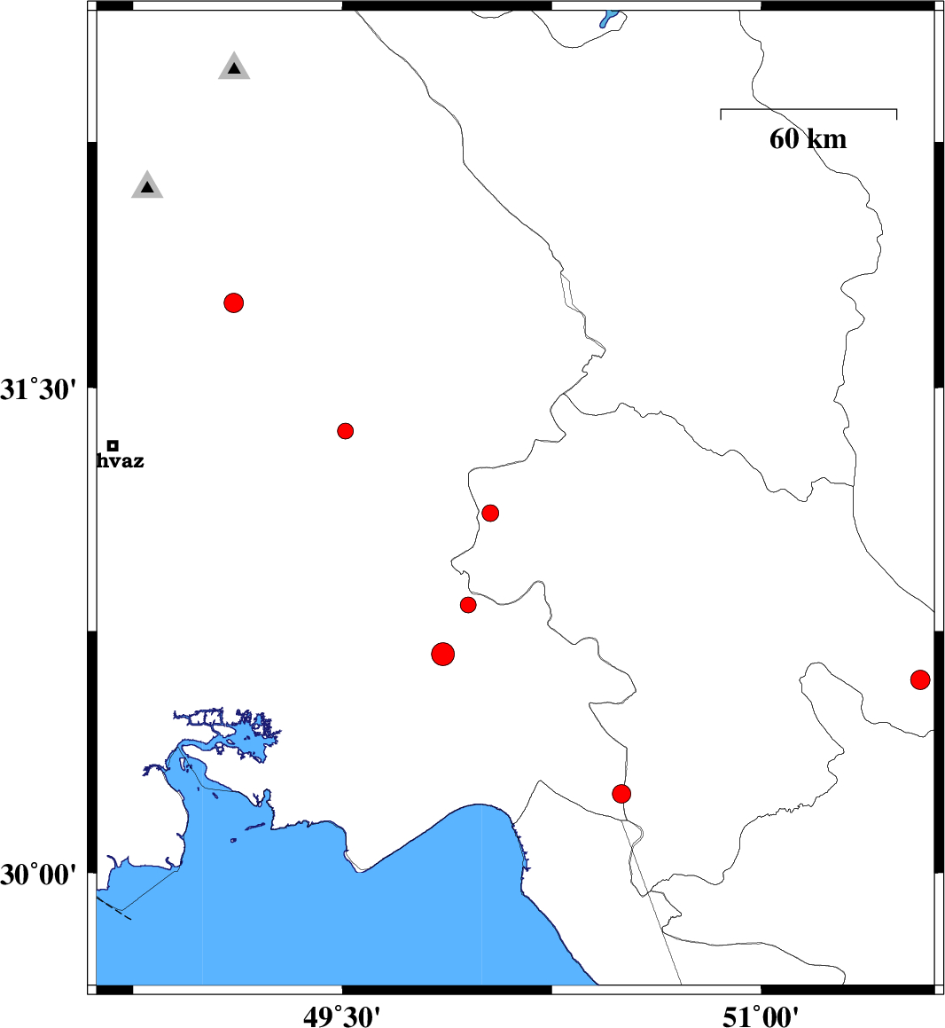 2010/08/30 | 18:17:03.6 | 22:47:03.6 | 31.15 | 50.12 | 46 | ML:2.9 | Kohkiluieh va boyerahmad Province, 46 km South-East of Bagh Malek | ||
