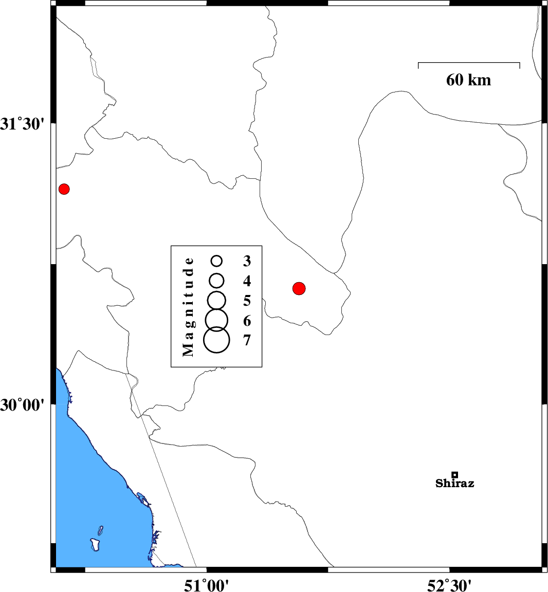 2010/09/02 | 04:54:30.8 | 09:24:30.8 | 30.62 | 51.57 | 18 | ML:3.5 | Kohkiluieh va boyerahmad Province, 6 km Yasuj | ||