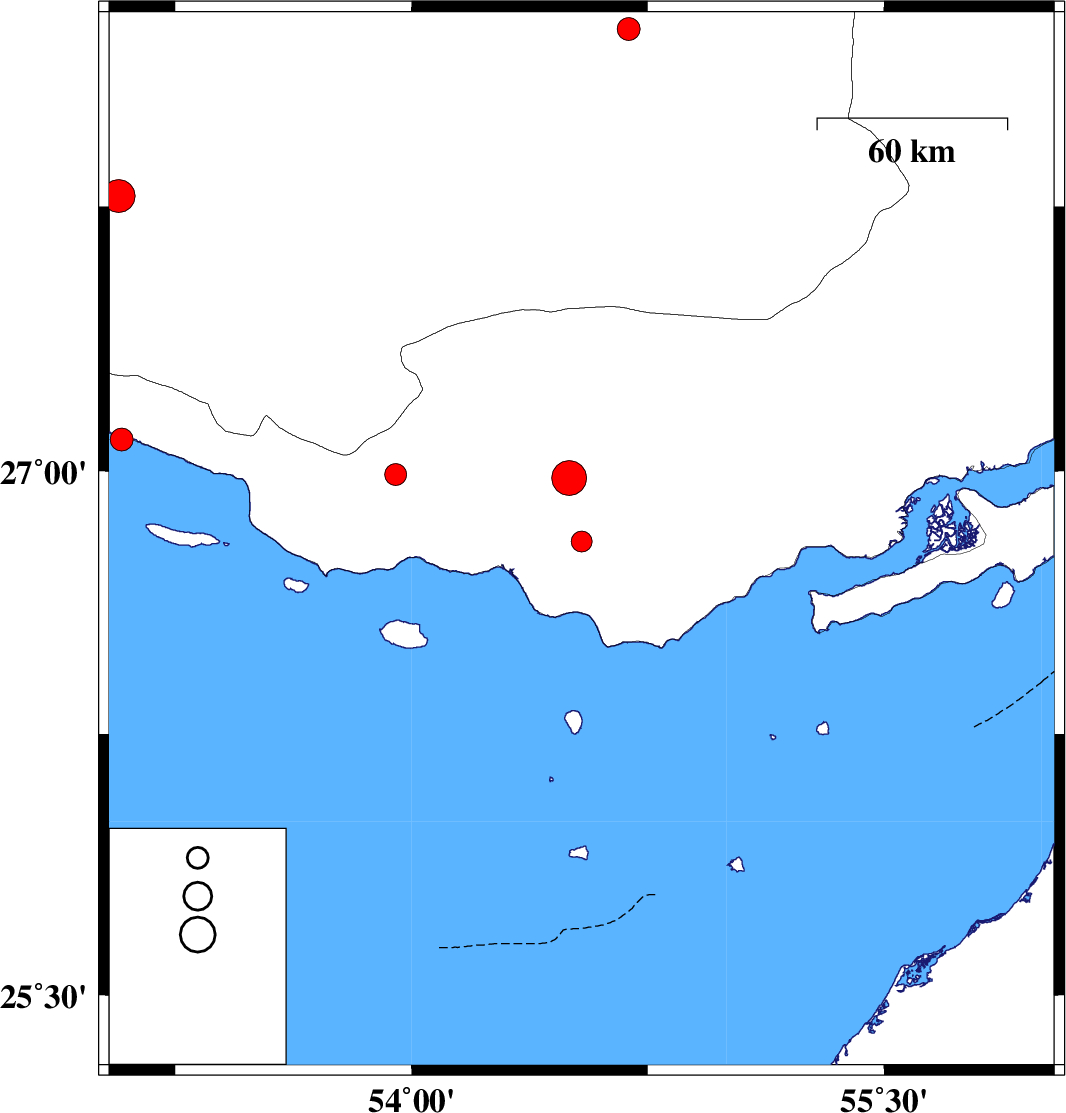 | 2010/09/07 | 02:53:45.7 | 07:23:45.7 | 27.09 | 53.08 | 17 | ML:3.2 | Persian Gulf, 28 km South of Lamerd | ||
