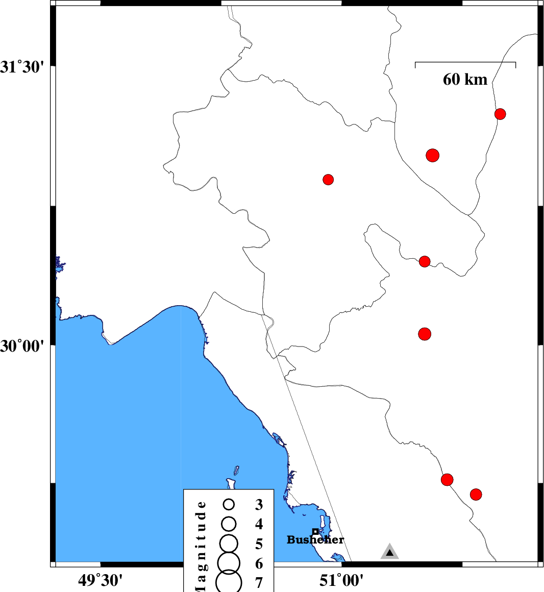 | 2010/08/15 | 01:48:48.7 | 06:18:48.7 | 29.45 | 51.04 | 18 | ML:3.2 | Bushehr Province, 26 km North-West of Borazjan |