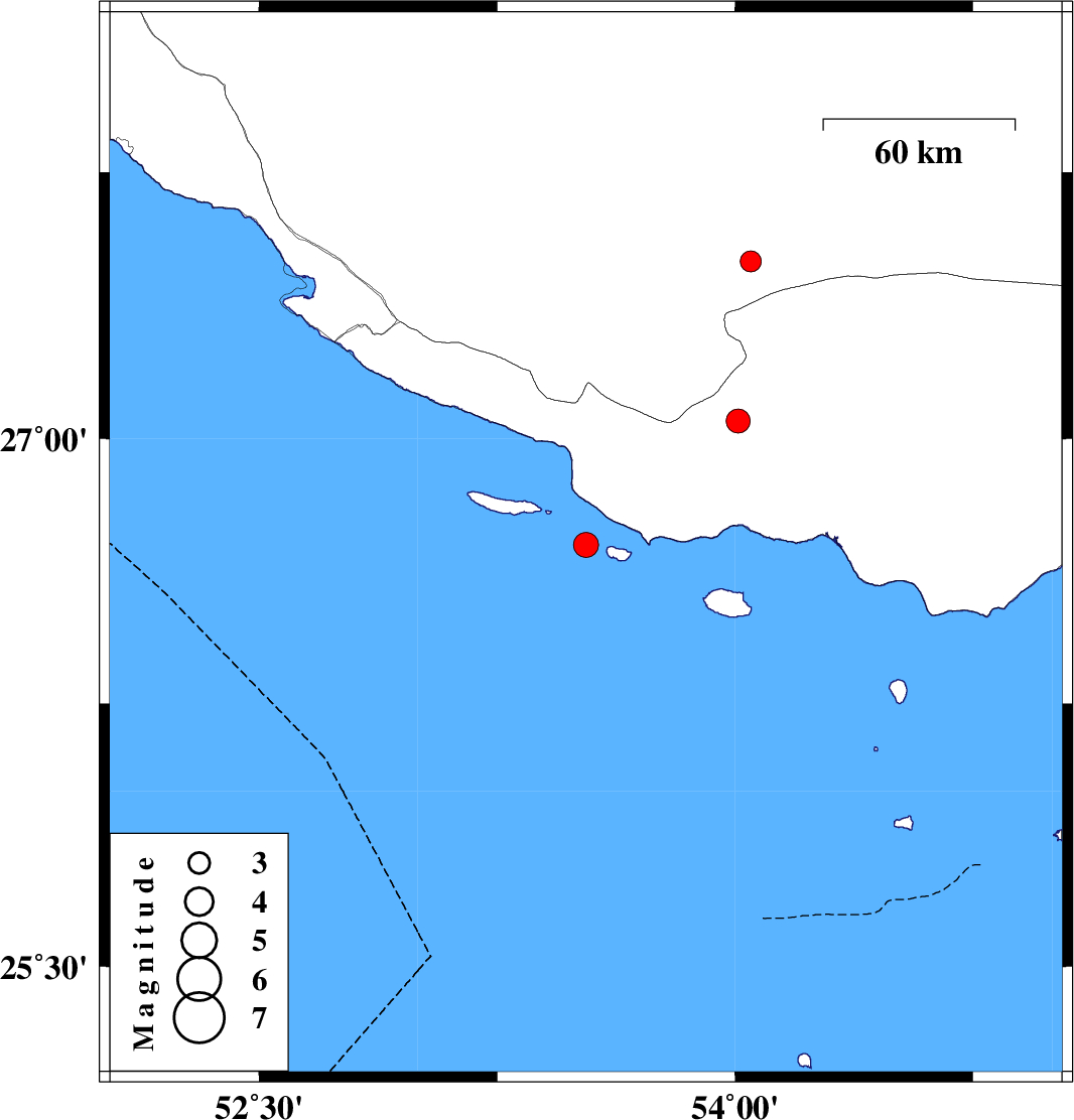 | 2010/09/27 | 05:53:42.5 | 09:23:42.5 | 26.7 | 53.53 | 46 | ML:3.5 | Persian Gulf, 79 km South-East of Lamerd | ||