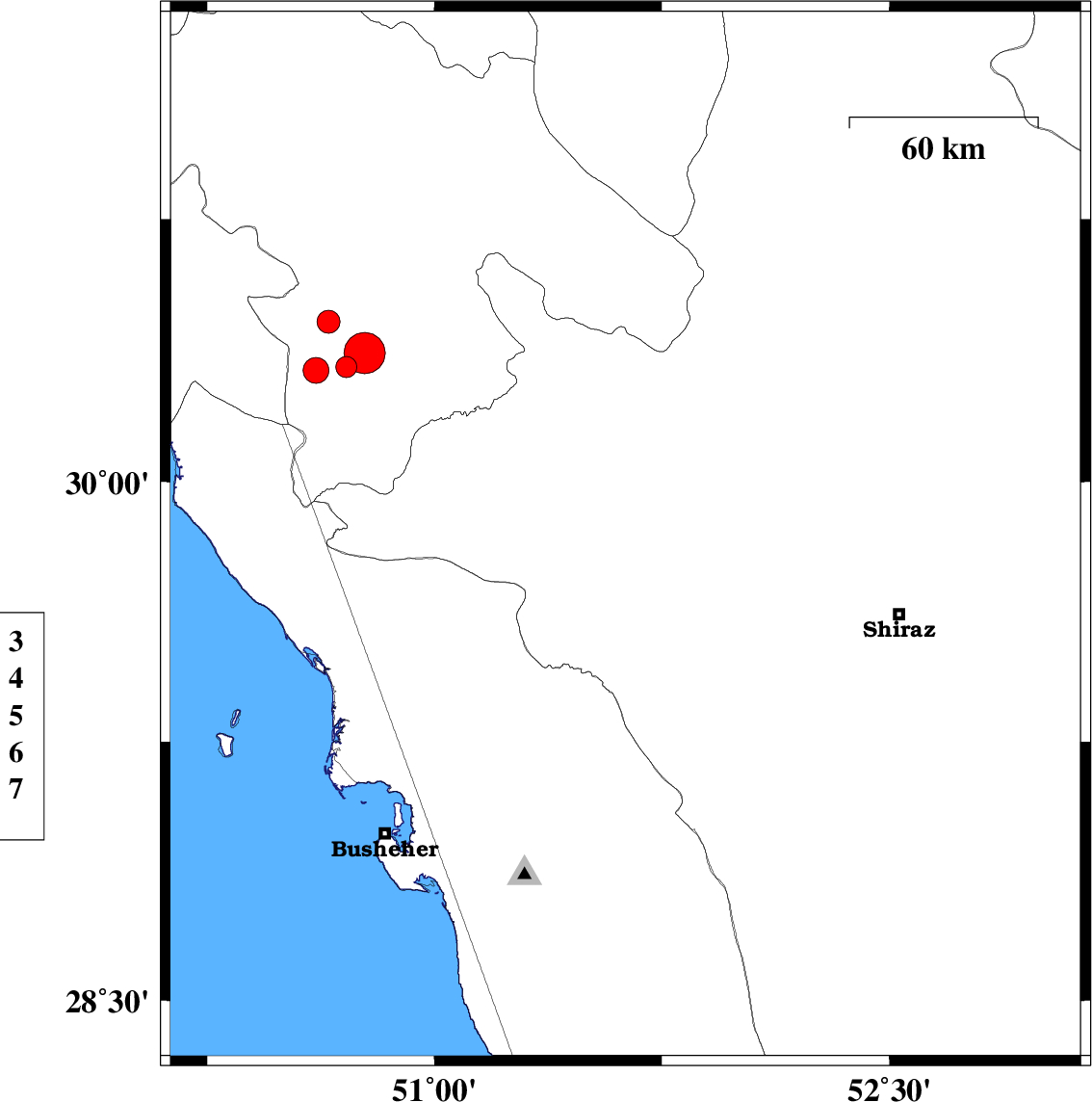 | 2010/09/27 | 11:22:44.6 | 14:52:44.6 | 29.75 | 51.75 | 15 | ML:6 | Fars Province, 17 km North of Kazerun |